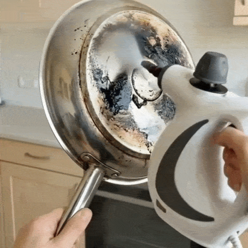 Tak, gorąca para pod wysokim ciśnieniem rozpuszcza nawet zaschnięty tłuszcz i przypalenia. W większości przypadków nie potrzebujesz szorowania, wystarczy skierować strumień pary i przetrzeć powierzchnię.